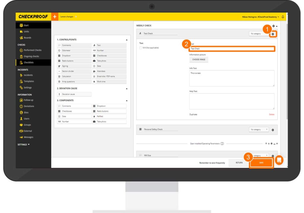 A checklist can consist of many checks. It is possible to update a checklist from the settings menu, where you can change the name of the checklist and assign permissions.