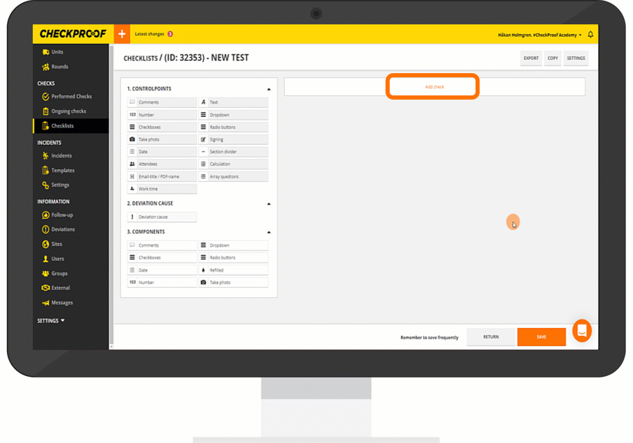 1. Click “Add Check” which will appear when you first create a checklist.