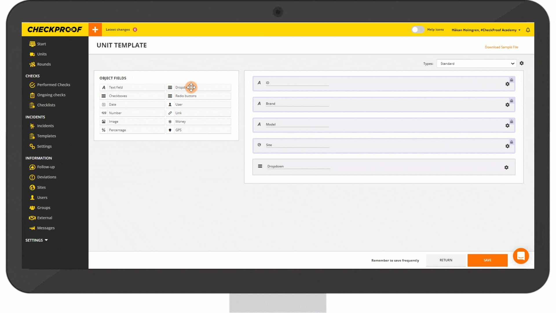 Just like a checklist, you can edit the template by dragging and dropping the fields that you want to add to the unit template.