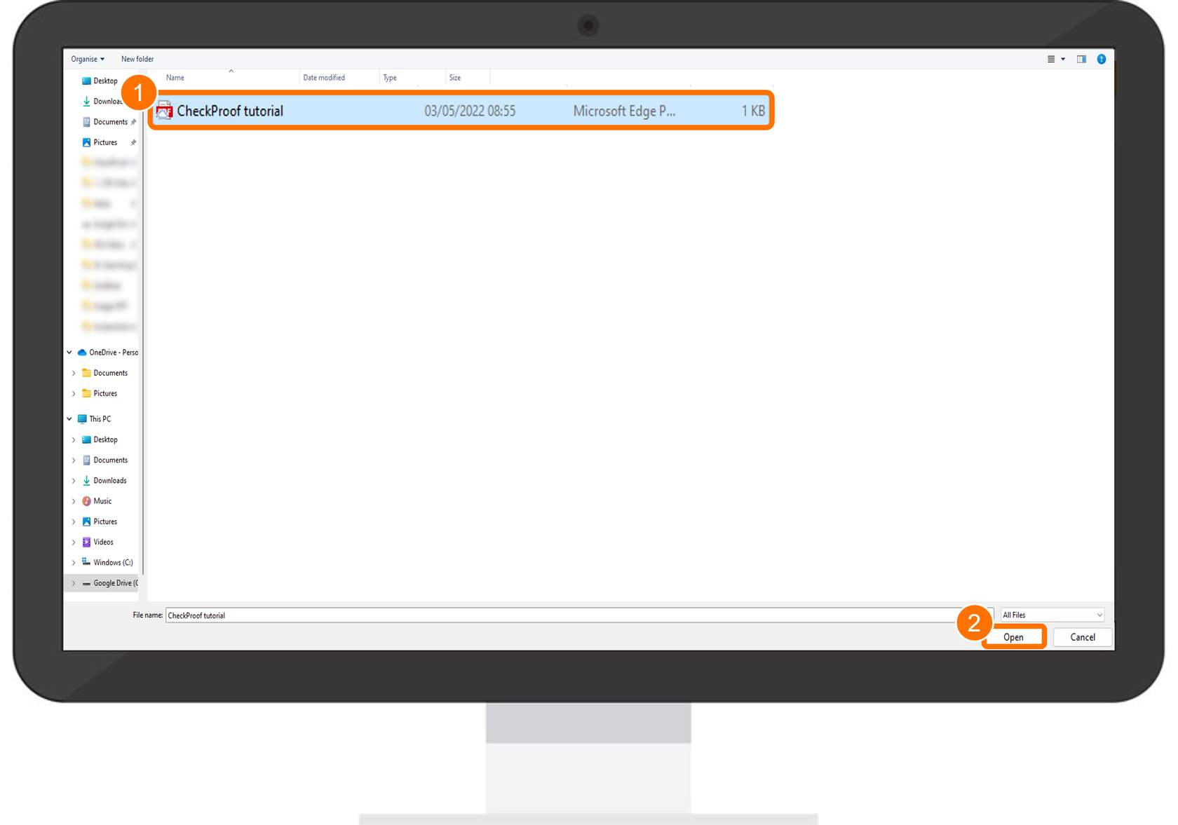 Now find the file you want to upload as a document to CheckProof. Select the document and then click the “Open” button to upload it.