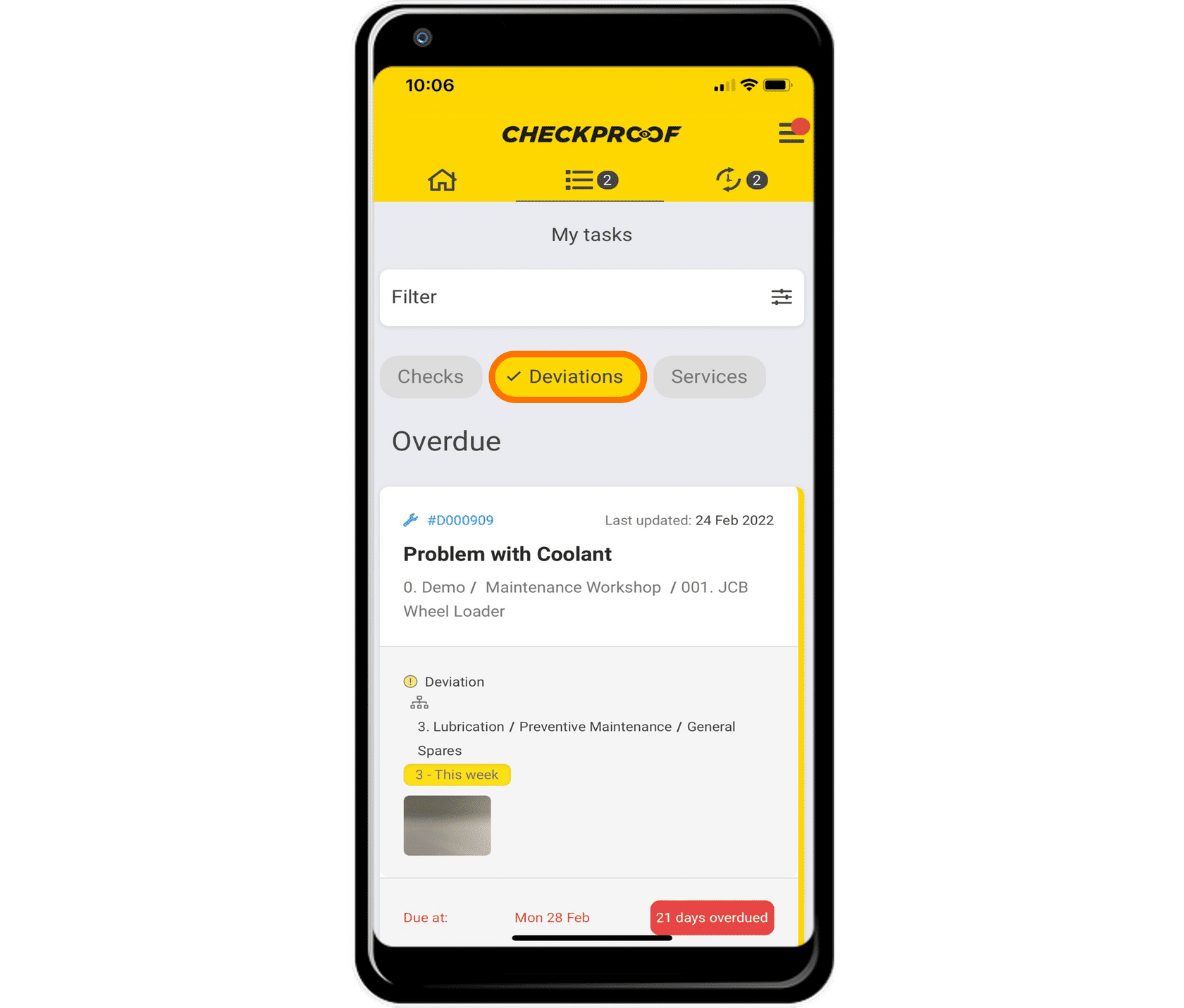 From the “My Tasks” menu, you can view all of your checks, deviations, and services. In this case, we have selected “Deviations” to view all active deviations.