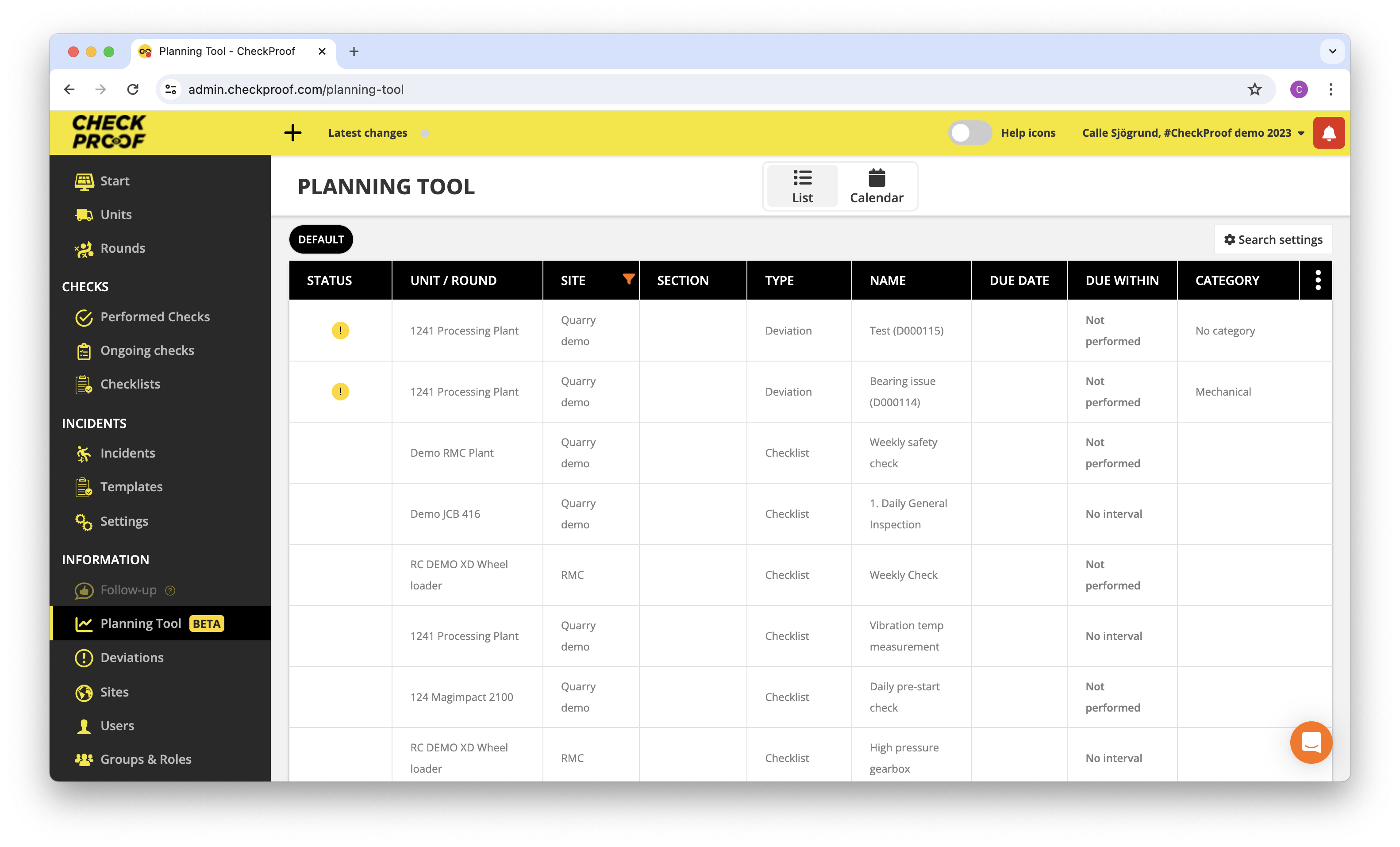 In the list view, you will be able to see all the due dates on the upcoming checks, but also for how long a deviation has been overdue.