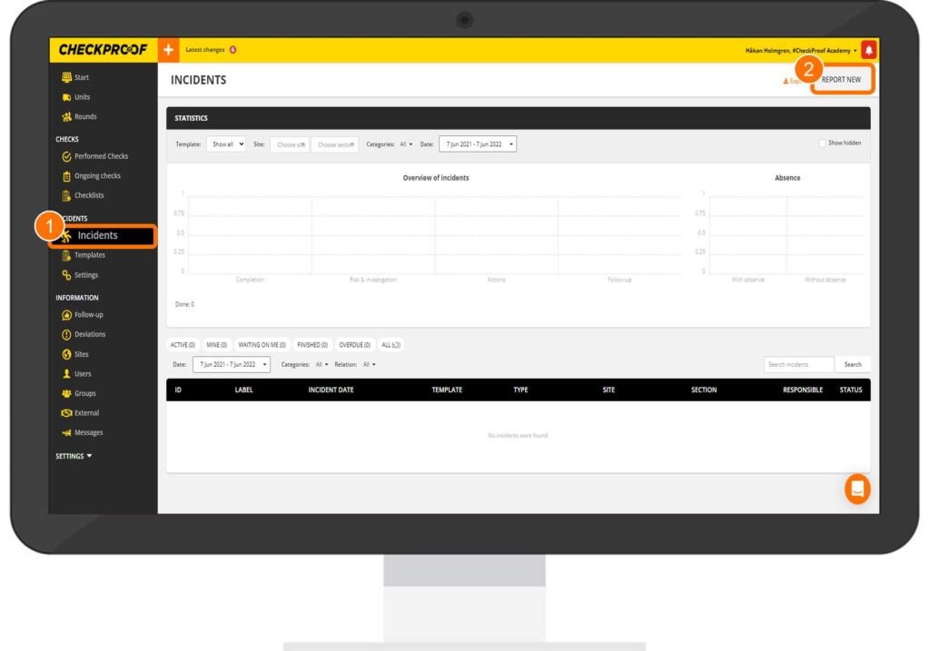 To report a new incident, you first need to select “Incidents” in the left-side panel, then click the “Report New” button