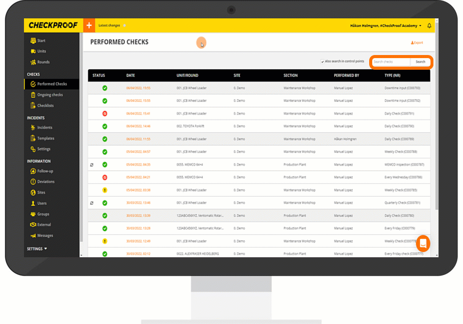 To do this, you can type in a keyword related to the status, date, unit, round, site, section, the person responsible, or type.