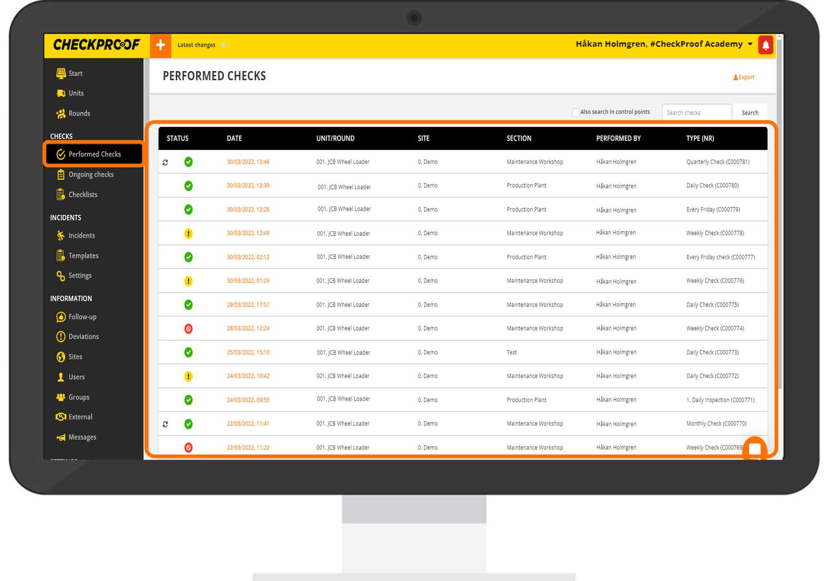 In the “Performed Checks” menu you can see all the checks that have been submitted. The colors indicate the status of each check: