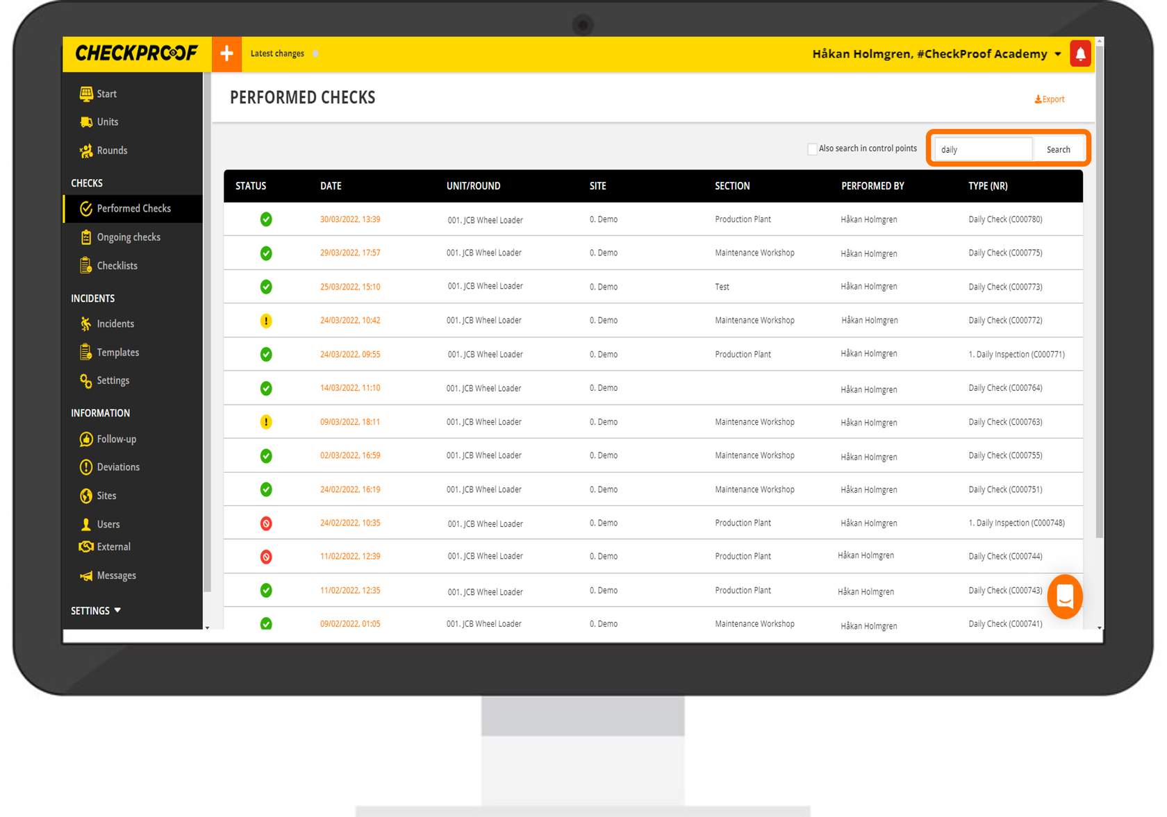 To do this, you can type in a keyword related to the status, date, unit, round, site, section, the person responsible, or type.